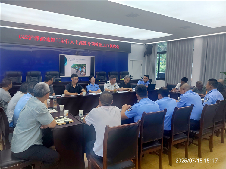 2025年7月15日,成南公司联合辖区高速公安、执法部门、蓬溪县道安办等单位、扩容建设LJ5、LJ6标段施工单位等,召开G42沪蓉高速扩容施工蓬溪段行人上高速专项整治联席会。成南公司遂宁管理处、南充业代处参加会议。