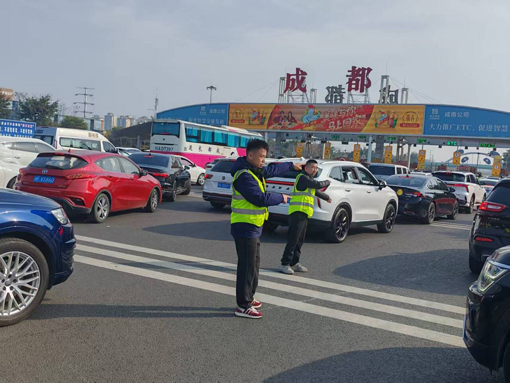 随着春节临近,成南高速成都收费站迎来车流高峰,单日车流量突破9万辆,较平日增长近两倍,通行压力急剧增大。为切实保障收费站通行顺畅,成都管理处快速响应、主动作为,组织管理处相关工作人员组建应急支援队伍,全力协助成都收费站开展缓堵保畅工作。