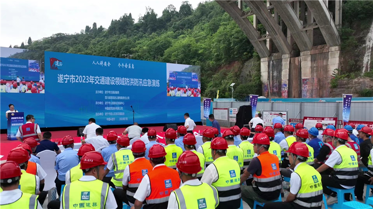 7月19日,遂宁市交通建设领域2023年防洪防汛应急救援演练在成南高速扩容工程LJ6标涪江特大桥举行。遂宁市交通运输局党组成员、安全总监刘永志,桂花镇党委书记罗中金,成南公司党委委员、副总经理秦朗,遂宁业主代表处,JL6标总监办、项目经理部、工友等150余人参加此次应急演练活动。