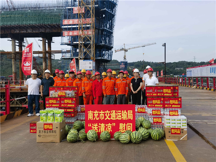 7月25日,南充市交通局党委书记、局长刘晓梅一行莅临成南扩容LJ4标嘉陵江特大桥进行大运会安全督导暨送清凉慰问工作。市交通局党委委员、副局长马七林,四级调研员刘平,成南公司南充代表处、总监办和项目部有关人员陪同。