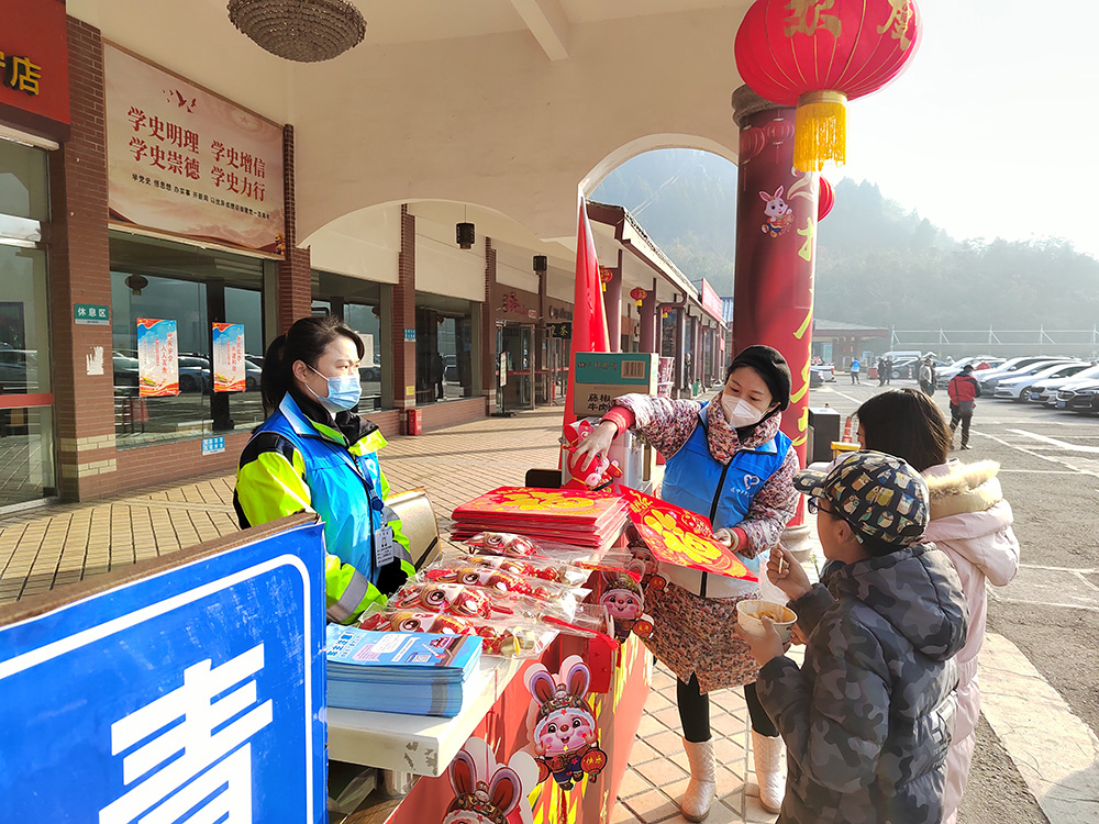 2023年 1月19日,成南公司遂宁管理处组织团员青年在遂宁服务区开展“青春志愿,爱在旅途”志愿者活动,为过往司乘人员提供宣传引导、暖心物资、便民利民等志愿服务,温暖出行群众回家路。