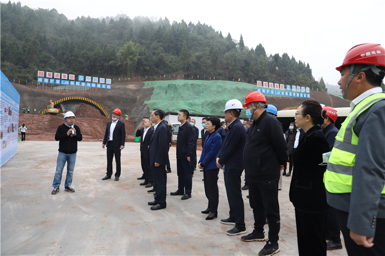 2022年10月27日,遂宁市委书记李江,市委副书记、市长刘会英一行赴成南高速扩容项目LJ6标陈家湾隧道调研督导。蜀道集团副总经理杨如刚,成南公司党委书记、董事长苏开春,党委委员、副总经理秦朗等陪同调研。