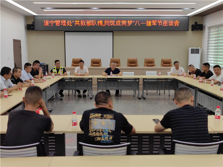 7月31日,在中国人民解放军建军96周年到来之际,遂宁管理处组织开展“共叙部队情,同绘成南梦”座谈会,庆祝“八一”建军节,辖区队伍军人代表参会。