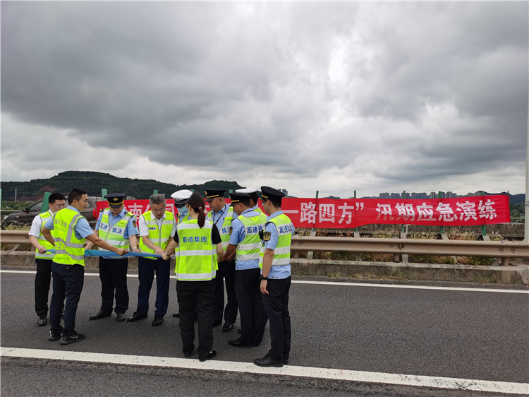 2022年7月27日,南充管理处联合高速公安五分局二大队、四大队,交通执法三支队三大队、五大队及南充市嘉陵江航道局开展2022年“一路四方”汛期应急演练。