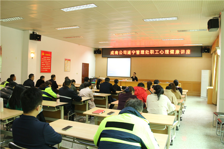遂宁管理处分工会组织开展“追求阳光心态 提升工作生活品质”职工心理健康教育培训活动。管理处科室人员、收费员、管护队员、服务区工作人员等岗位共计40余名员工参加培训。