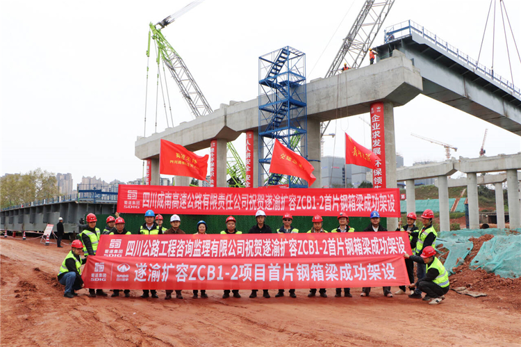 2026年3月19日,上跨遂渝高速扩容项目主线的徐家堰大桥施工现场,一台最大起重量达400吨的履带吊将一片长50米、宽2米、重约110吨的钢箱梁平稳吊起,精准地架设到盖梁上,遂渝高速扩容全线首片钢箱梁架设作业取得圆满成功。